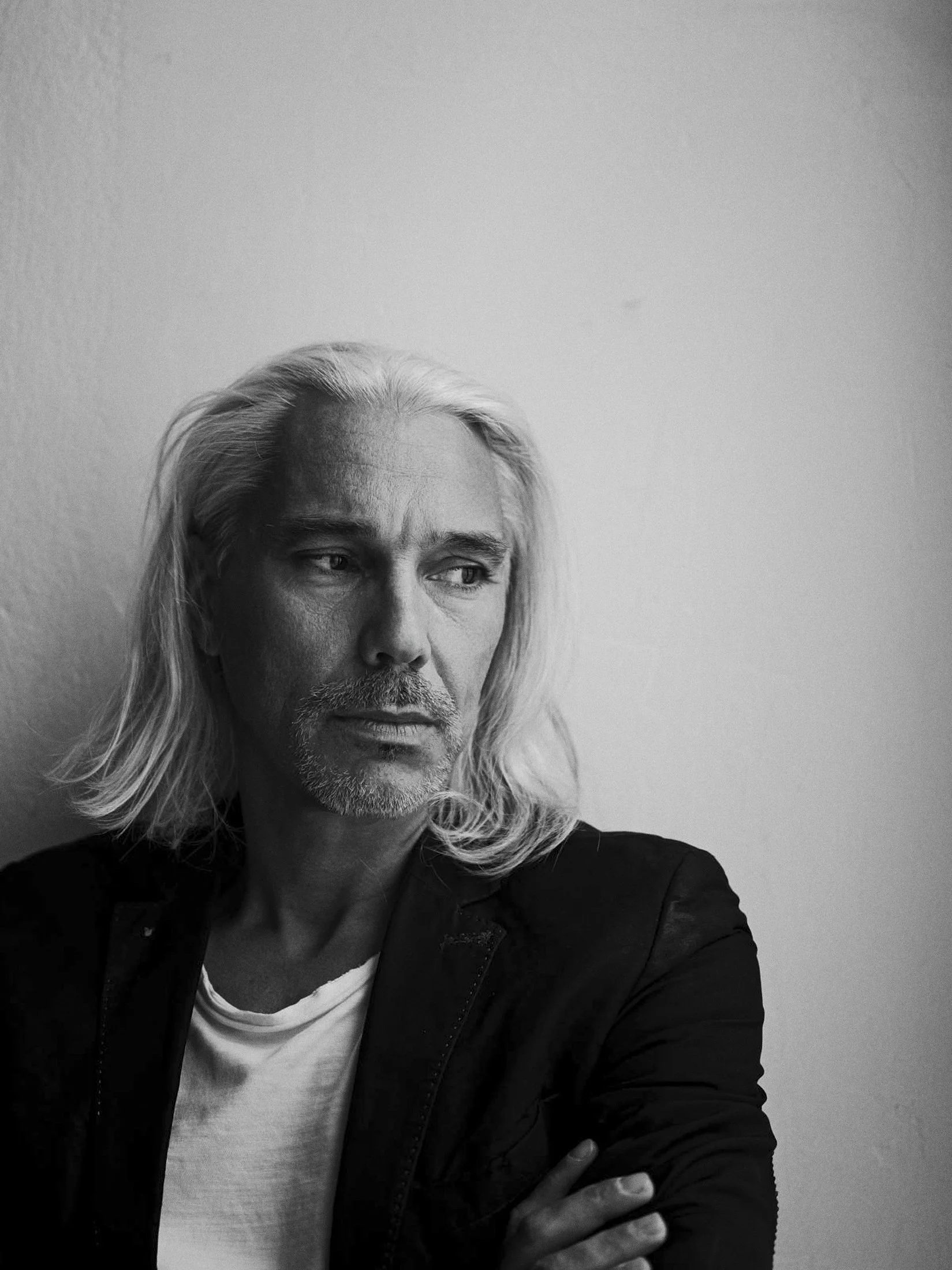 Black and white portrait of a person with long hair and facial hair, resting their head on their hand.